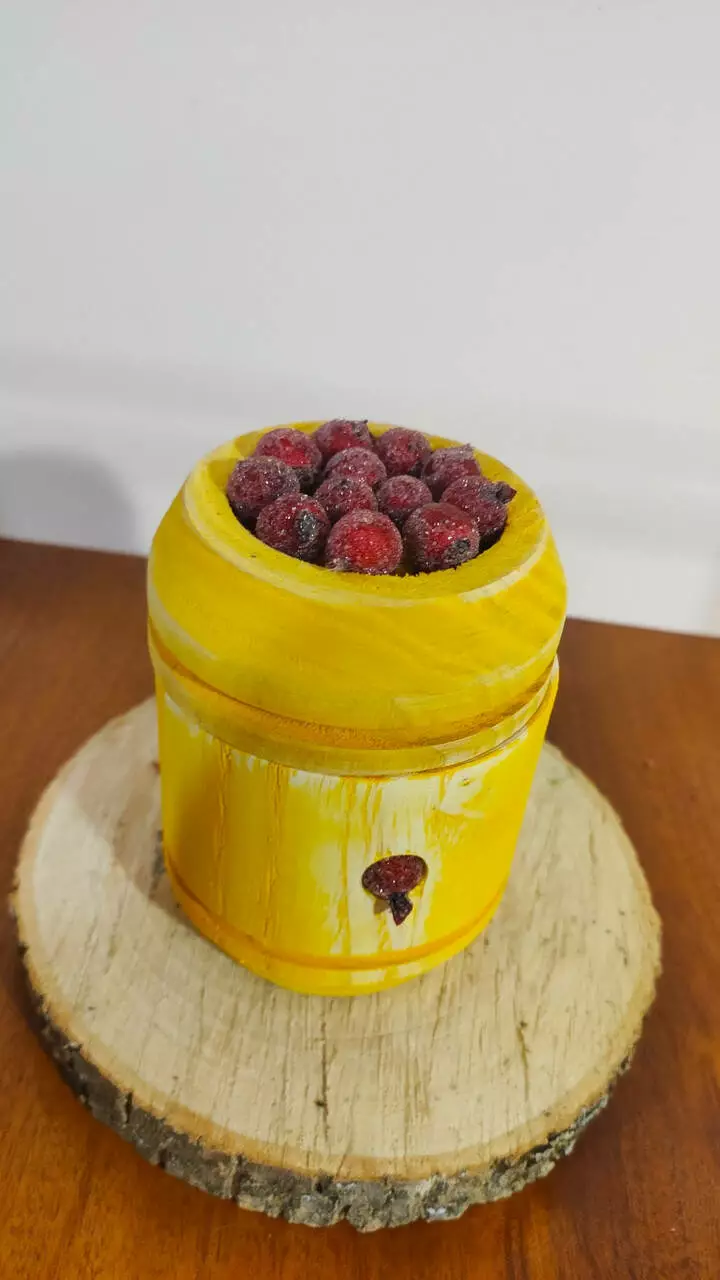 Бочонок із суцільного дерева. Всередині покритий тонким шаром бджолиного воску, для створення ідеальних умов зберігання меду. Виготовлений за індивідуальним проєктом, тому аналогів в Україні та світі немає!Вручну прикрашений декоративними ягодами. Наповнений ароматним і смачним медом Різнотрав'я. Місткість 140 г (100 мл)
