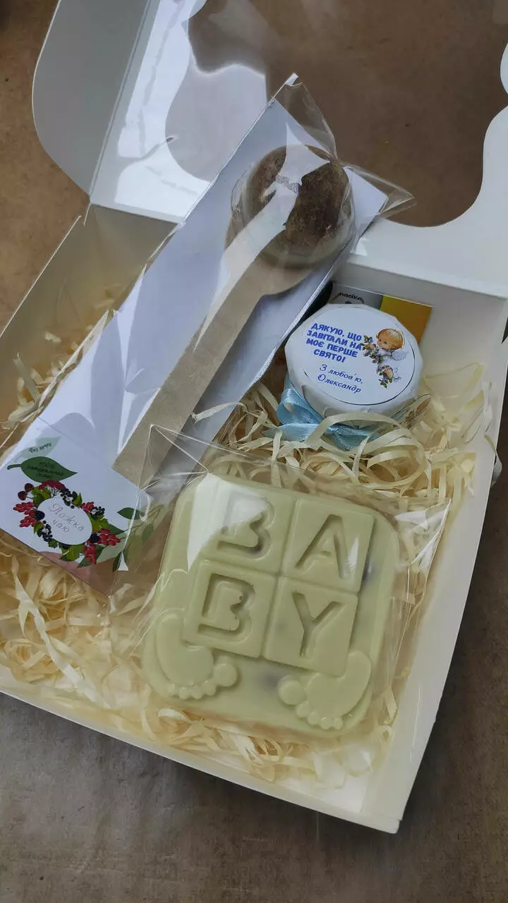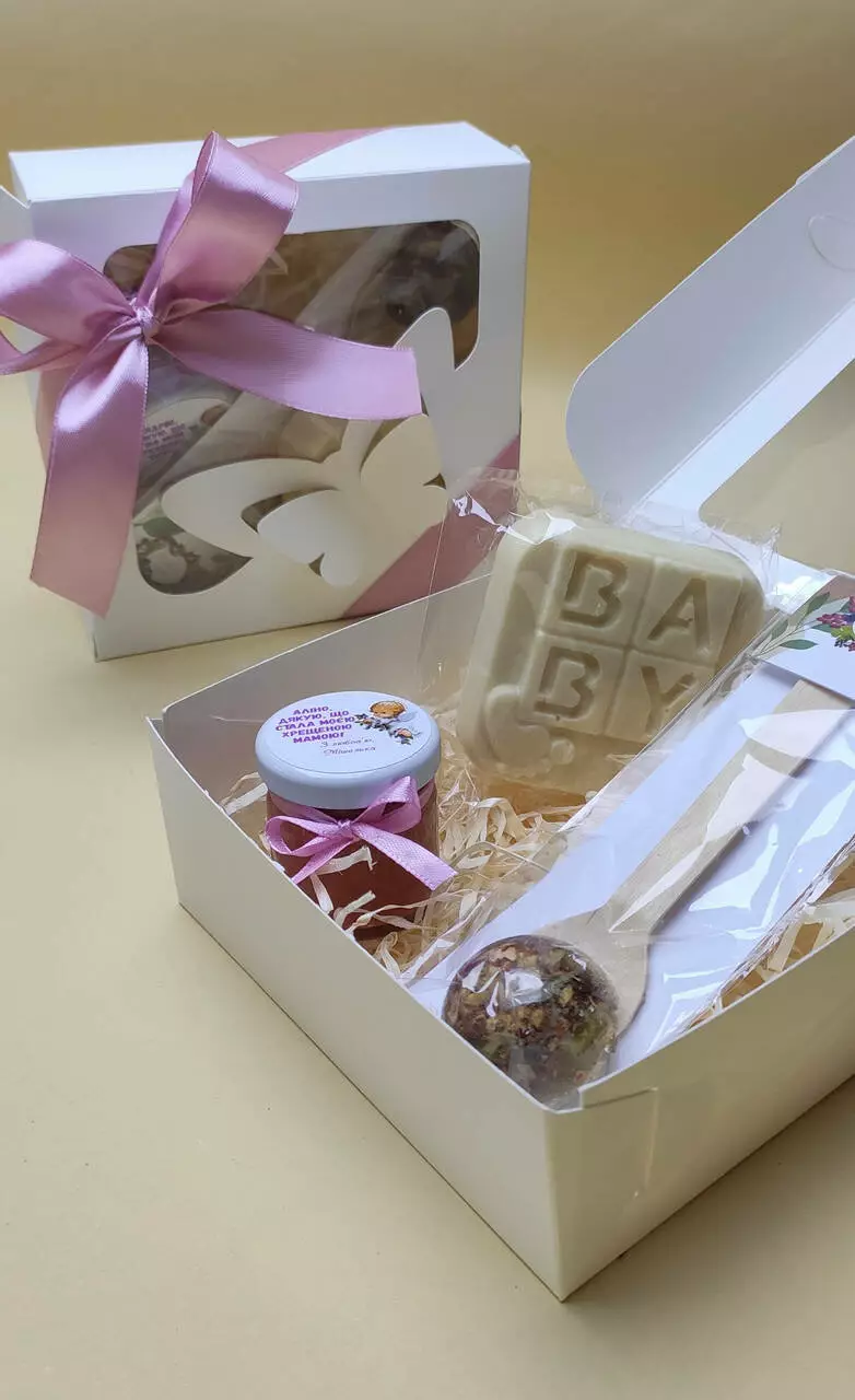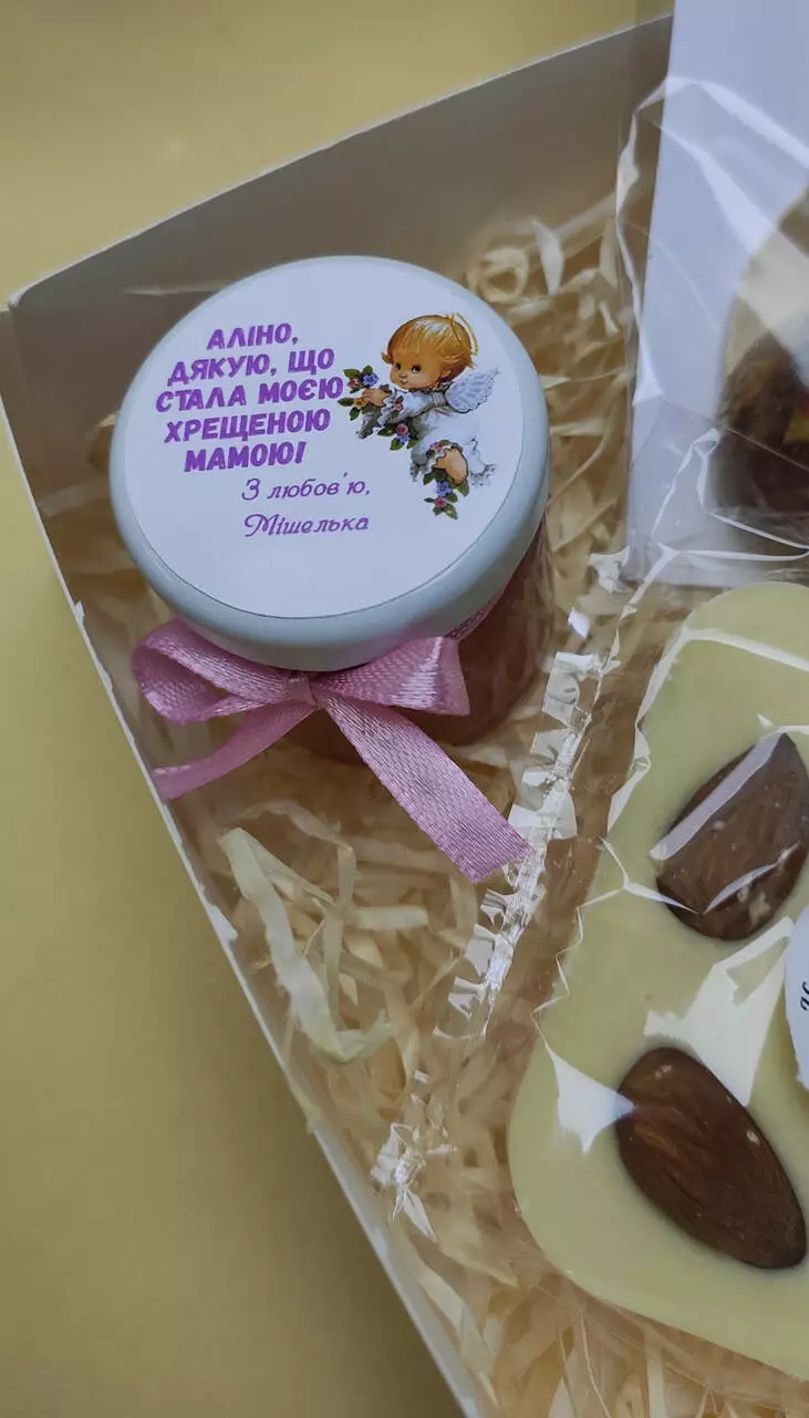 Солодкий подарунок для хрещених на згадку про радісну подію хрещення. За наповненням у баночці може бути ніжний крем мед (з полуницею, смородиною, цитрусом, какао з фундуком, солоний горішок) або мед з цілісними горішками (мигдаль, фундук, арахіс, грецький, кешью з вишнею). У наборі дуже ароматний чай в оригінальній упаковці з ложкою, а також фігурка з бельгійського шоколаду з цілісними горішками. Набір оформлені в подарунковій коробці зі стрічкою.
