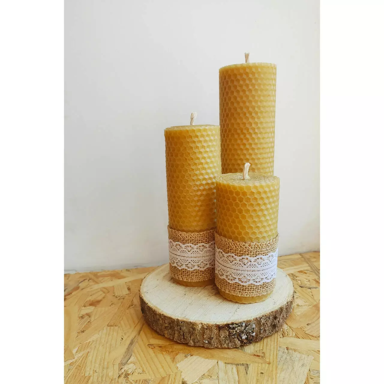 Набір свічок з вощини декорований мішковиною з мереживом.