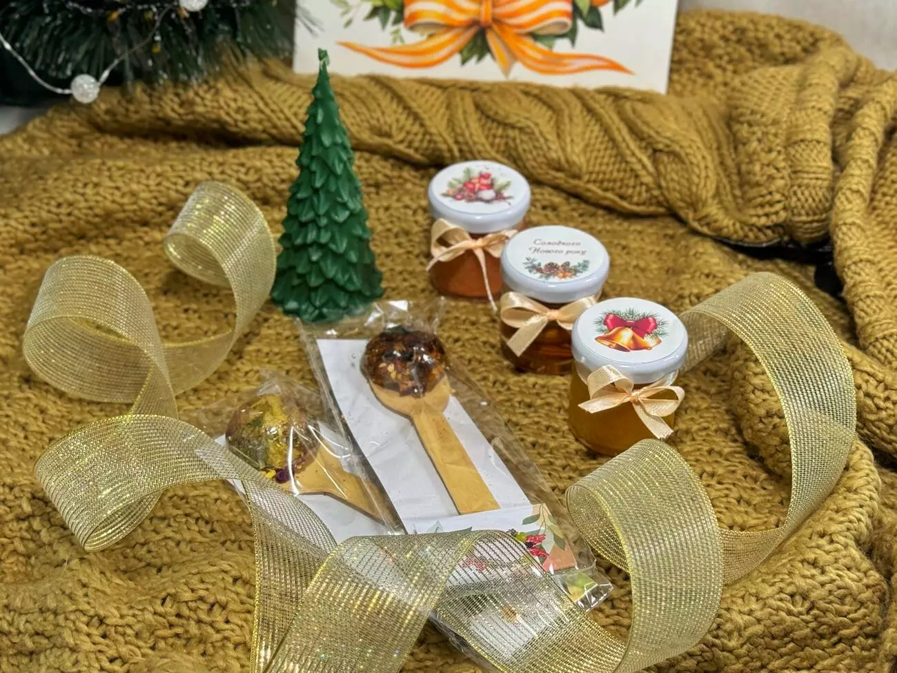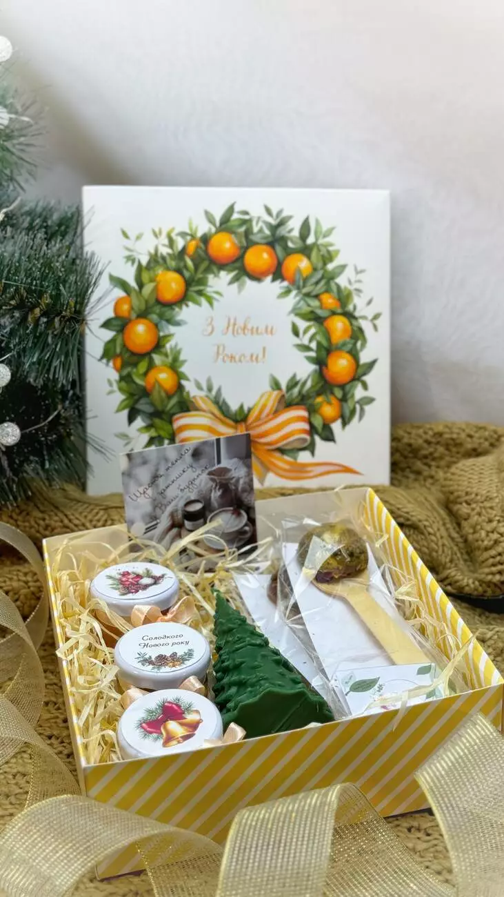 Набір в яскравій подарунковій коробочці. На кожній баночці є привітання новорічні. За вашим бажанням в коментарях до замовлення вкажіть який текст маємо зазначити, навіть іменні привітання.