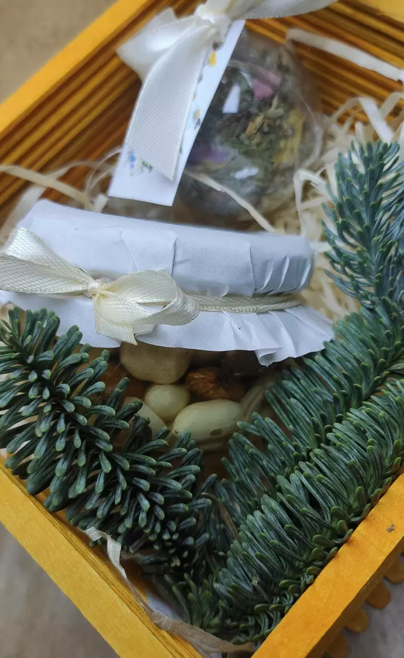 Набір доповнений гілочкою живої ялинки Нобіліс (яка довго тримає