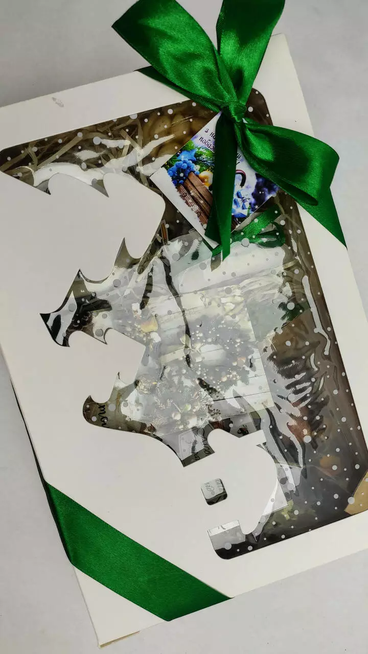 У наборі є вітальня листівка, він прикрашений стрічкою й биркою.