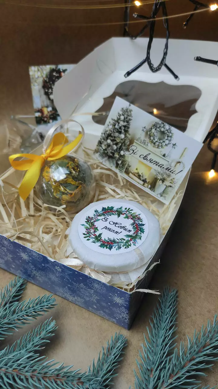 Набір в подарунковій коробочці, з листівкою, біркою та стрічкою.