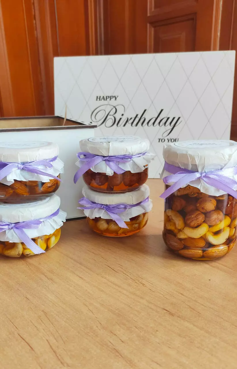 - Мед з горіховим асорті 300 г (вмикає в себе 5 різновидів горішків)