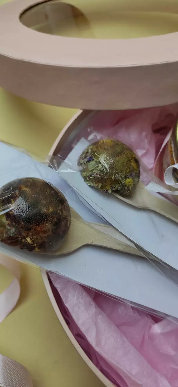 2 різновиди ароматного чаю в дерев’яних ложках – трав’яний чай з пелюстками квітів та лісовими ягодами, запакований у прозорі розчинні сфери в дерев'яних ложках.