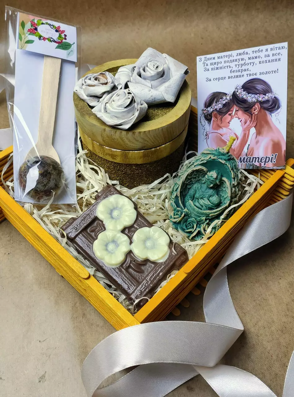 Набір оформлений у подарунковому дерев'яному боксі, доповнений листівкою (можна замінити за бажанням) та стрічкою.