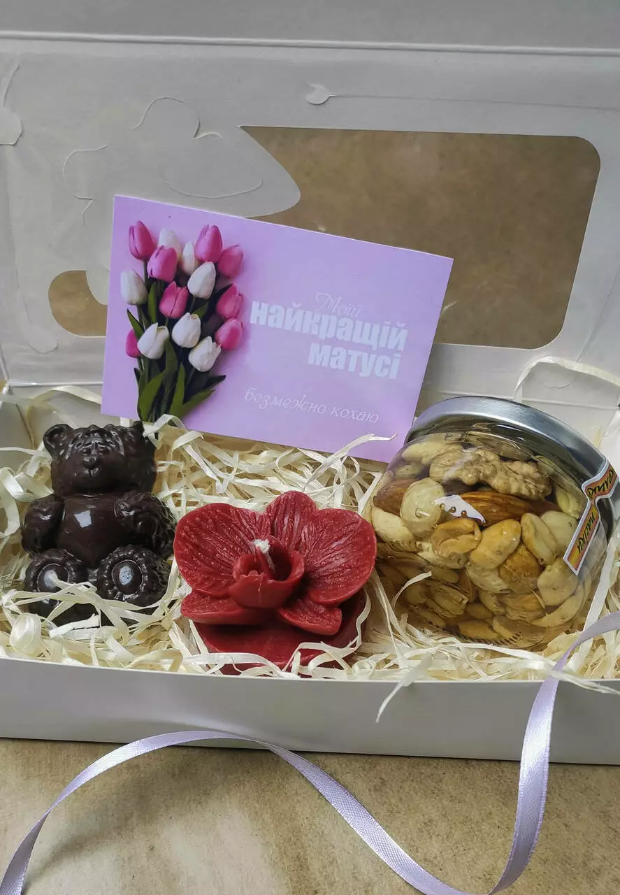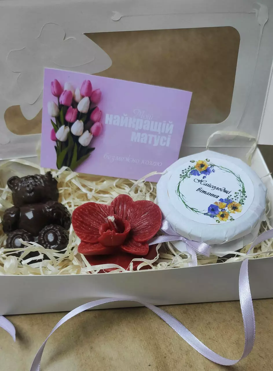 Набір оформлений у подарунковій коробочці, доповнений листівкою (можна замінити за бажанням) та стрічкою.