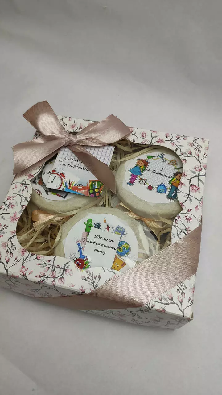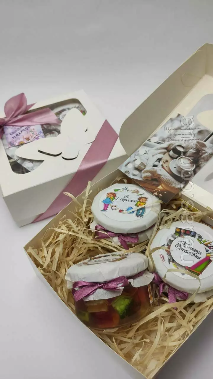 Написи на баночках можуть бути будь-які на ваше бажання, іменні вітання. Набір упакований у подарунковій коробці, доповнений листівкою, стрічкою.