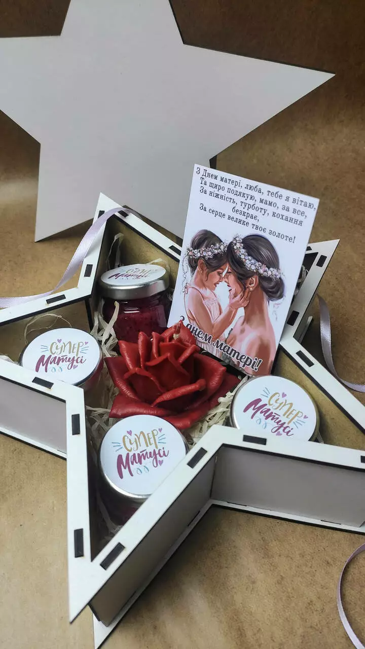Подарунок із турботою для коханої матусі. Він дарує яскраві емоції та солодкий післясмак. Написи на баночках можна змінити на ваше бажання.