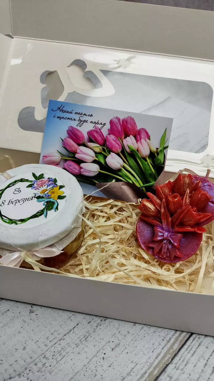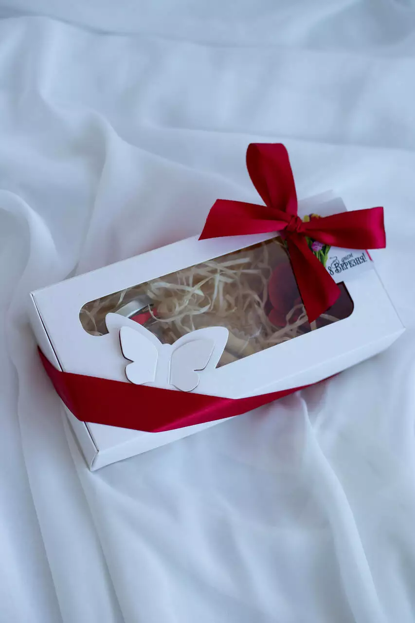 Набір доповнений вітальною листівкою та прикрашений стрічкою та біркою. Напис на баночці може бути будь-яким за вашим бажанням, будь-якою мовою. Також можливе розміщення логотипу компанії чи іменні привітання.