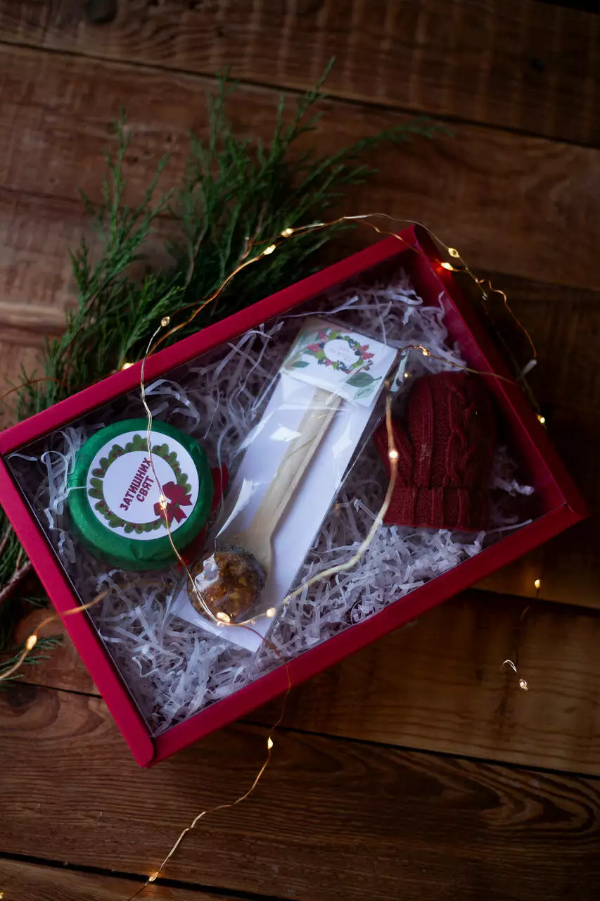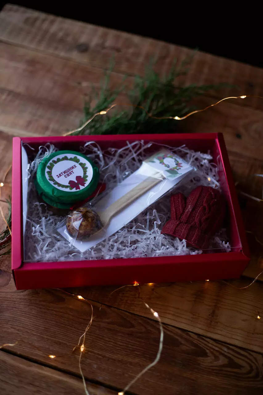 Набір упакований у подарунковій коробці, доповнений листівкою та стрічкою.