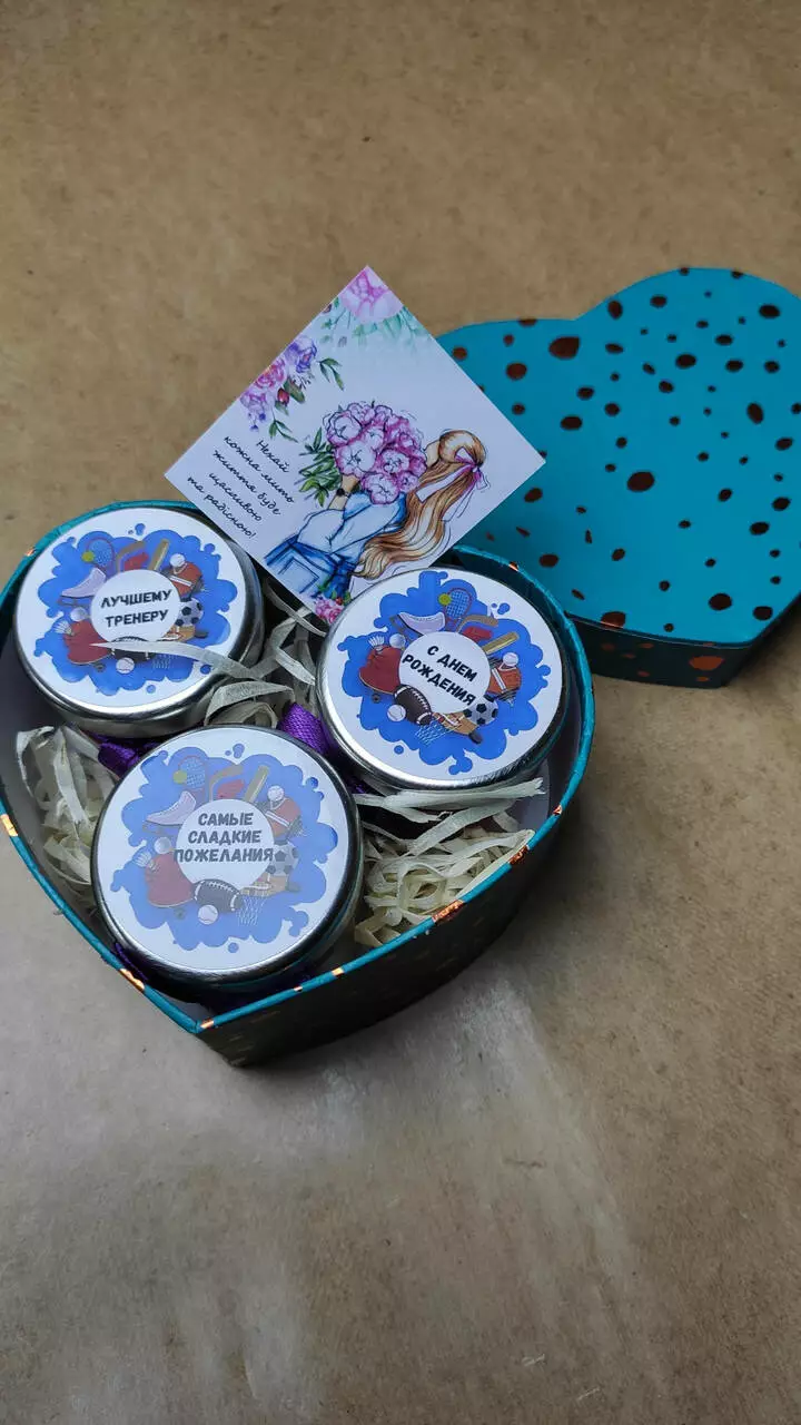 Набір упакований у подарунковій коробочці, яку зручно використовувати надалі для зберігання. Доповнено вітальною міні-листівкою. Напис на баночці може бути будь-яким за вашим бажанням, так само можна розмістити логотип компанії.