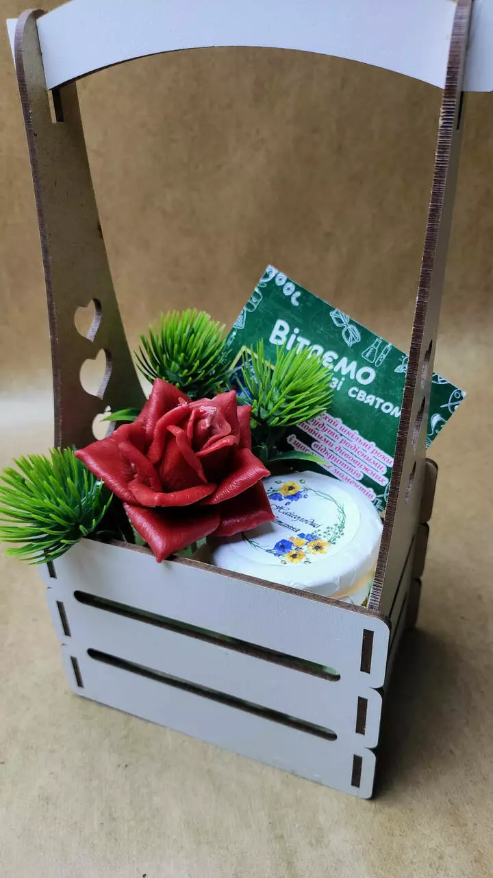 Набір доповнений вітальної тематичні листівки. Запакований у дерев'яному кошику.