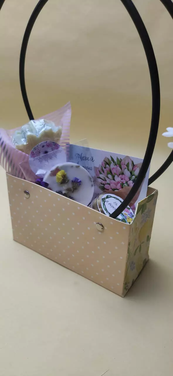 • Подарункова упаковка – набір оформлений у стильну картонну сумочку з яскравим принтом. Додається вітальна листівка.