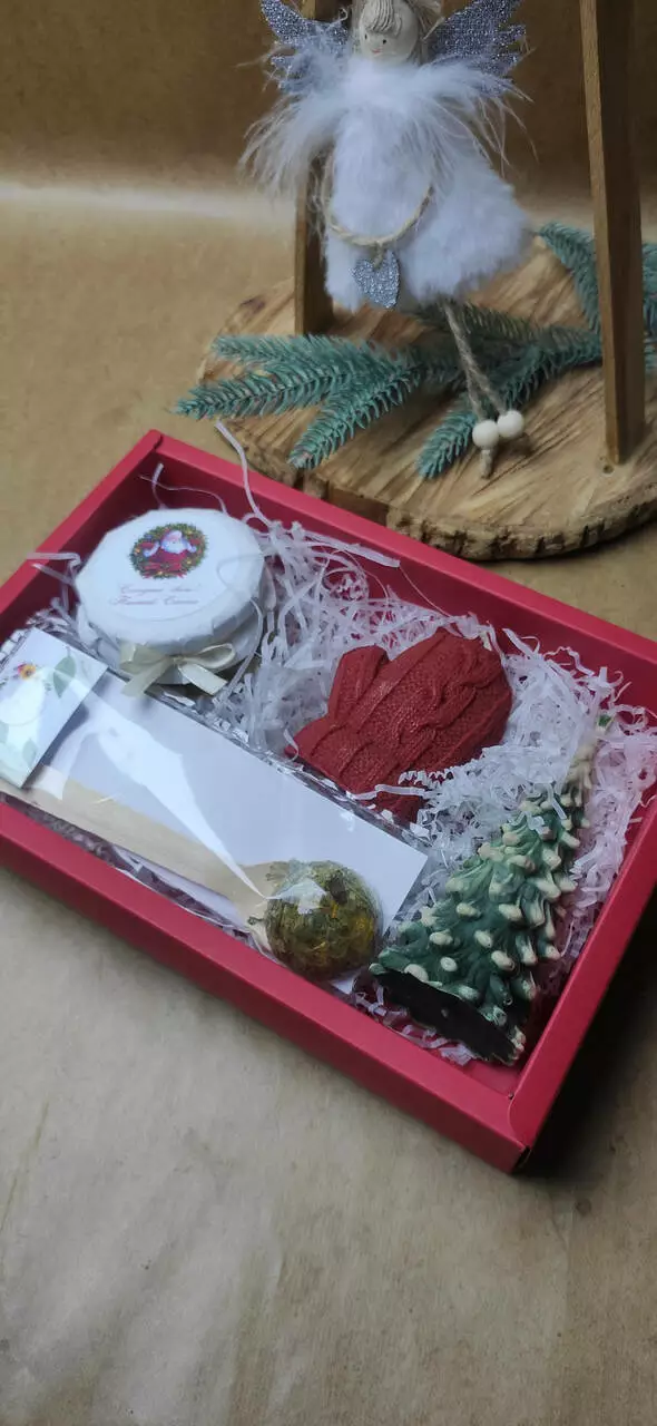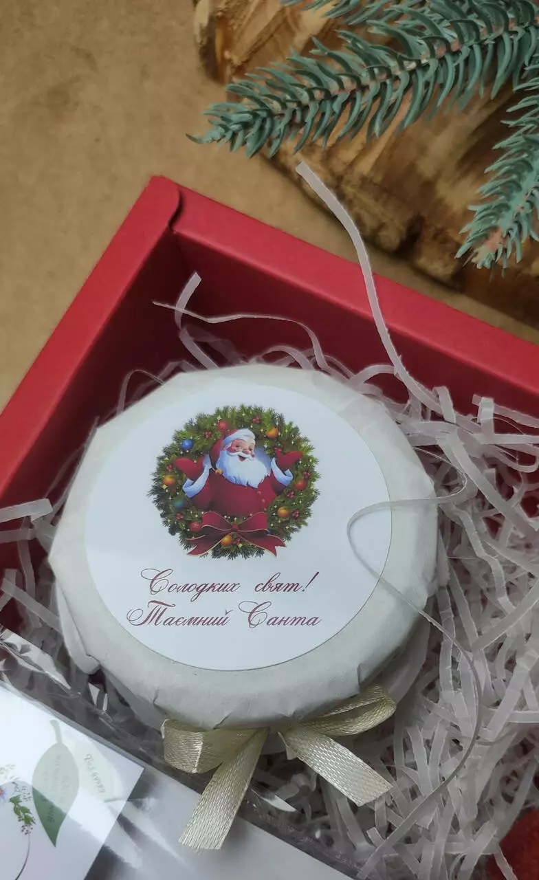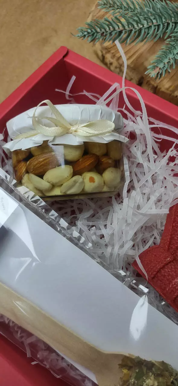 Набір доповнений вітальну листівку та прикрашений стрічкою та биркою. Напис на баночці може бути будь-яким за вашим бажанням, будь-якою мовою. Також можливе розміщення логотипу компанії.