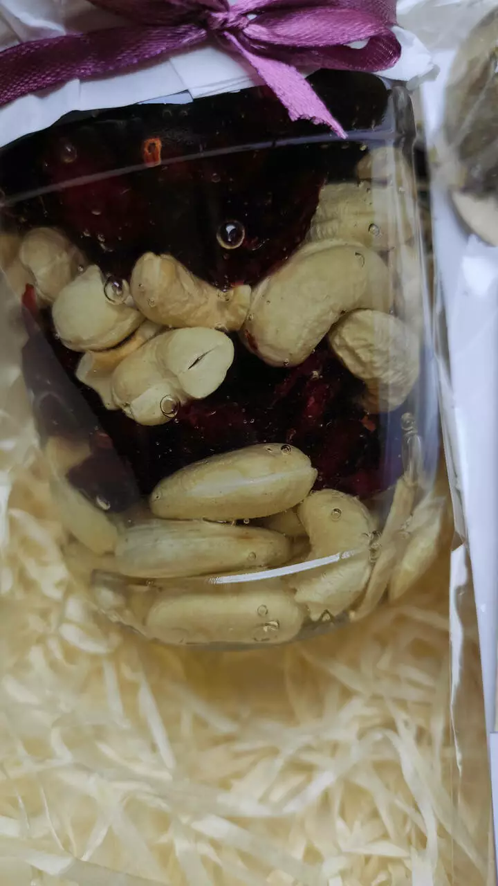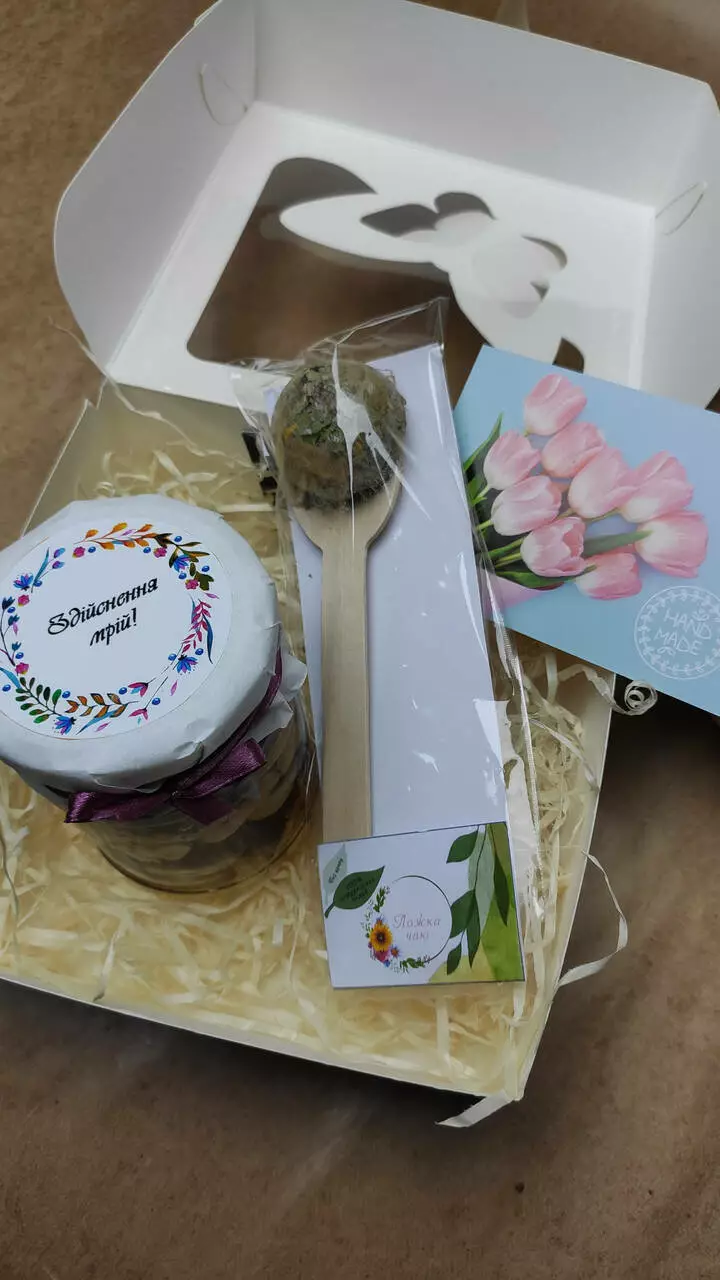 Цей красивий і стильний подарунок обов'язково залишить приємний смак і яскраві емоції. Поєднання натурального меду з кешью і журавлиною (300г), а також смачний трав'яний чай з пелюстками квітів, до якого додається оригінальна ложечка. Крім того, ви можете персоналізувати напис на баночці чим завгодно – від іменного привітання до логотипу вашої компанії!