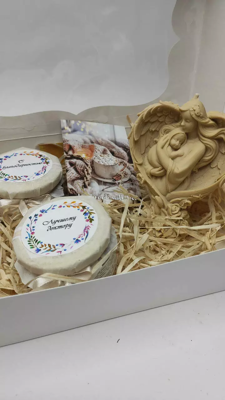 Набір доповнено вітальною листівкою та прикрашено стрічкою та біркою.
