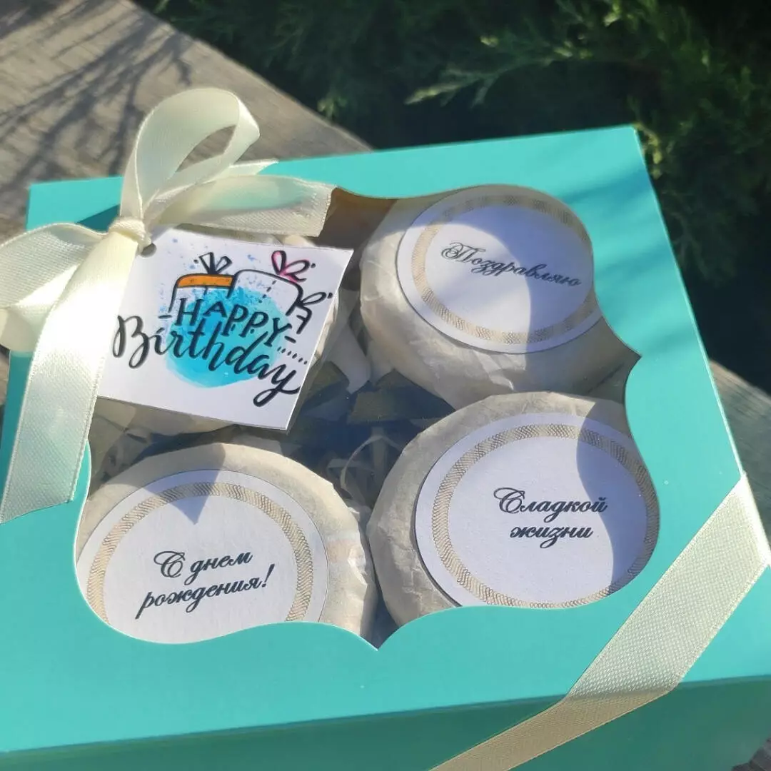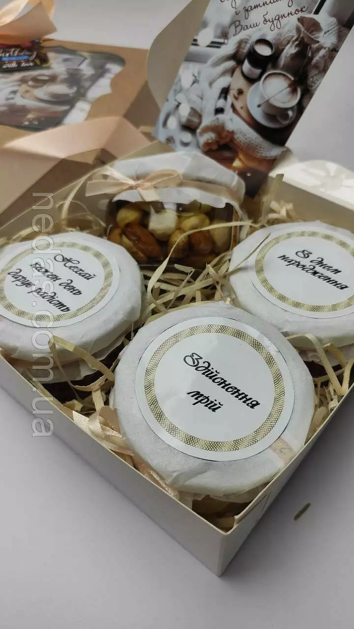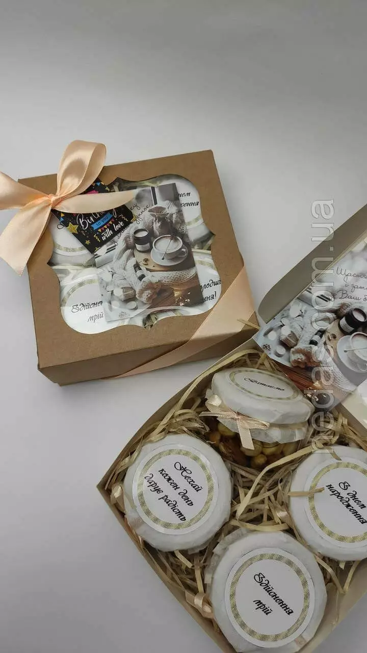 Написи на баночках можуть бути будь-які за вашим бажанням/іменні привітання. Набір у подарунковій коробці, доповнений вітальну листівку, бирку та стрічку.
