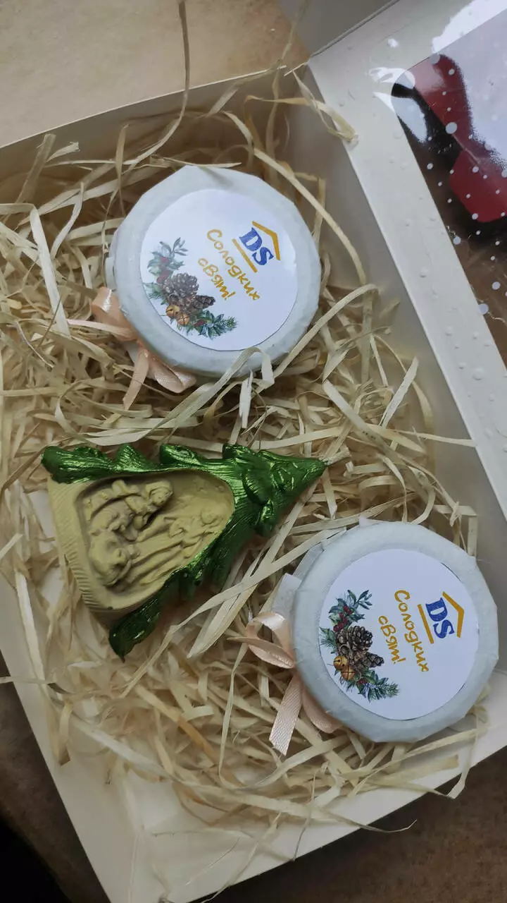 Набір доповнений вітальну листівку та прикрашений стрічкою та биркою. Напис на баночці може бути будь-яким за вашим бажанням, будь-якою мовою. Також можливе розміщення логотипу компанії.