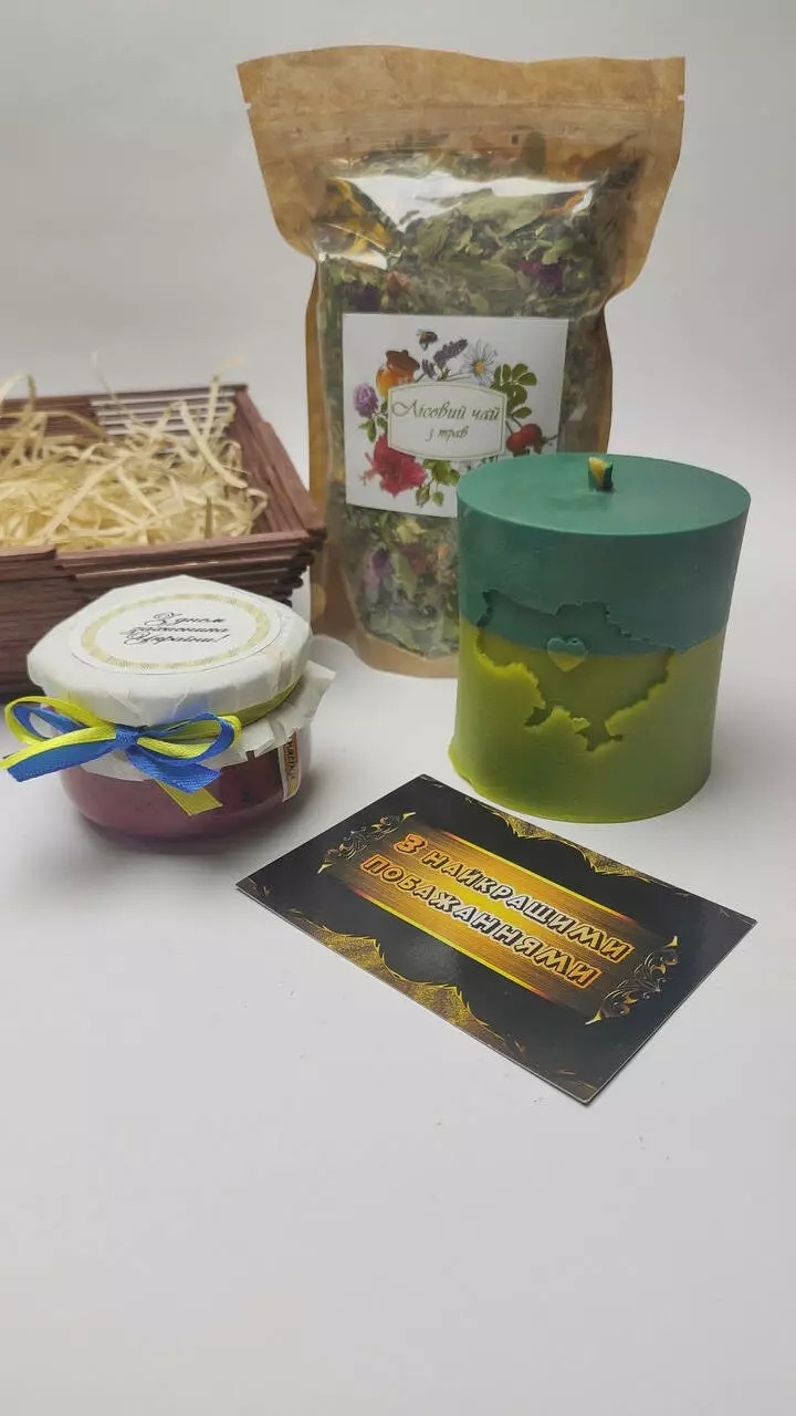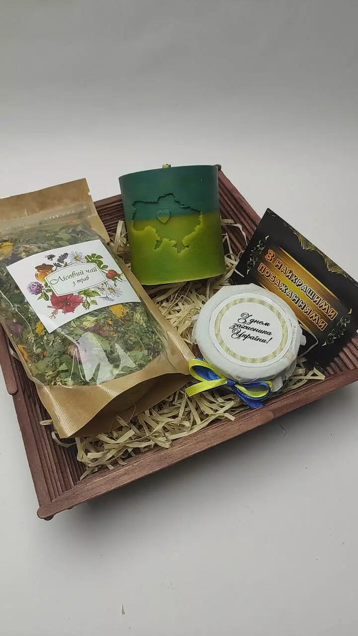 Подарунковий набір в дерев'яному кошику, яки стильно виглядає та можна використовувати надалі в побуті.