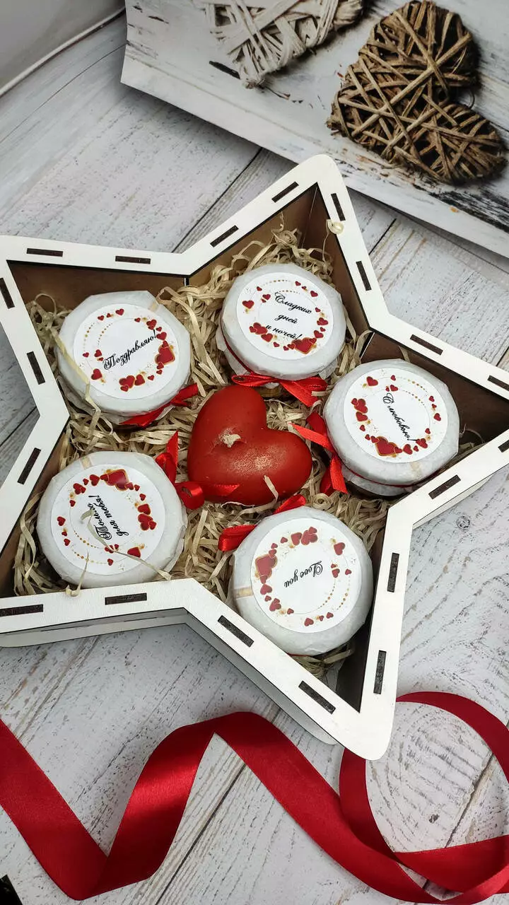 Набір доповнено тематичною вітальною листівкою, упаковано в дерев'яну подарункову коробку Зірка зі стрічкою та биркою.