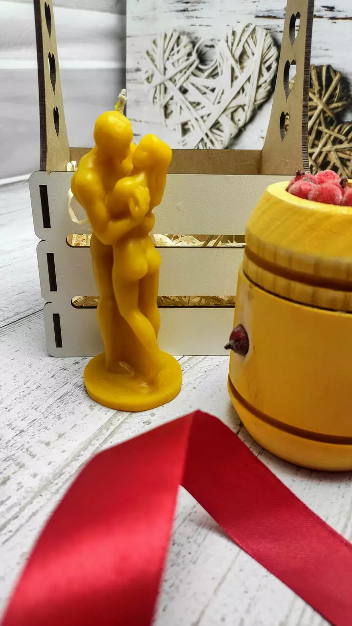 Свічка Обійми з натурального бджолиного воску ручної роботи. Має ніжний медовий аромат. Для фарбування свічки використовуємо тільки спеціалізований свічковий барвник, який не має стороннього запаху і не виділяє шкідливих речовин під час горіння.