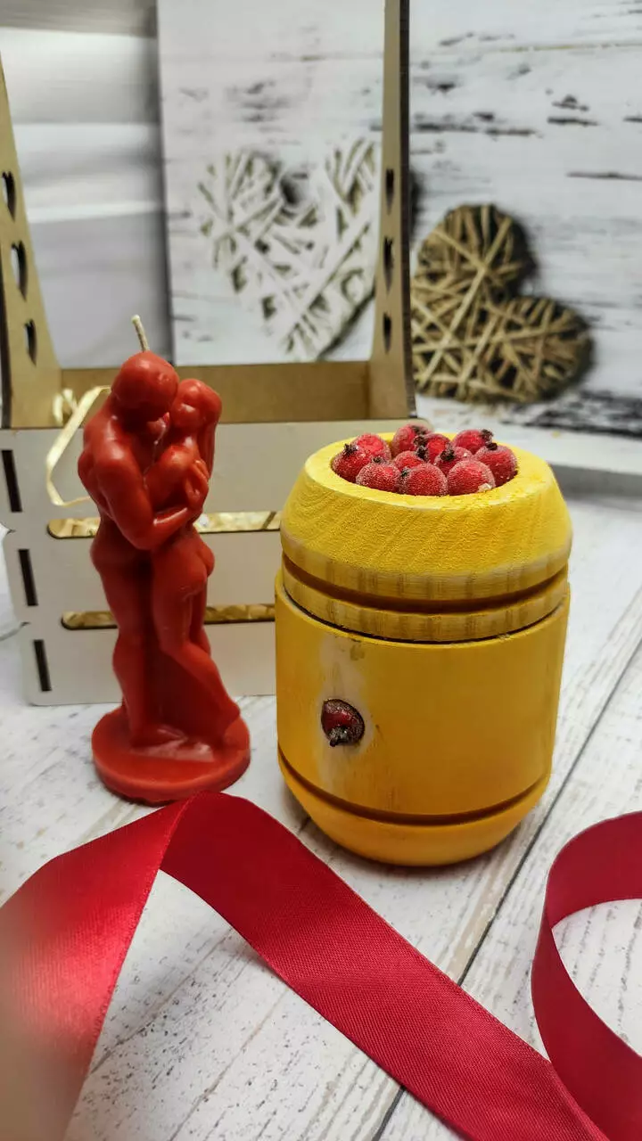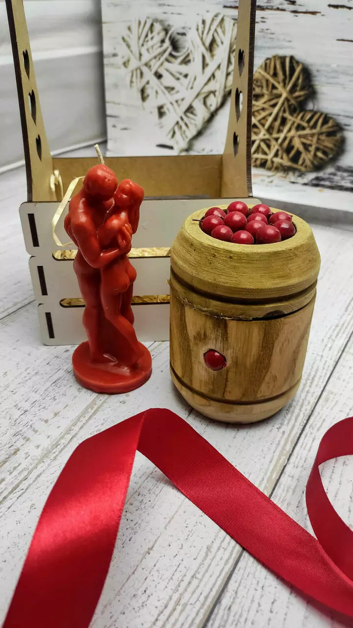 Бочонок із цільного дерева ручної роботи, прикрашений декоративними ягодами. Усередині бочонок вкритий тонким шаром бджолиного воску і наповнений смачним і ароматним медом з власної пасіки. Бочонок зроблений за індивідуальним макетом, тому аналогів в Україні та світі немає.