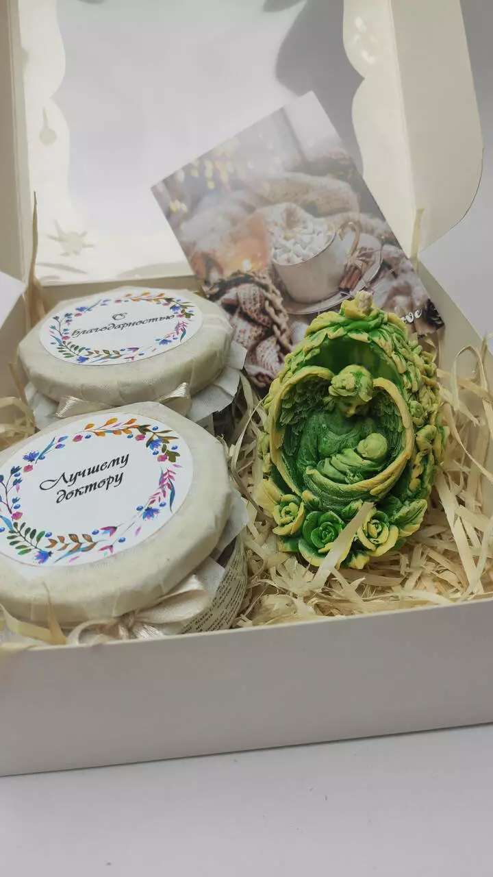 Набір доповнено вітальною листівкою та прикрашено стрічкою та біркою.