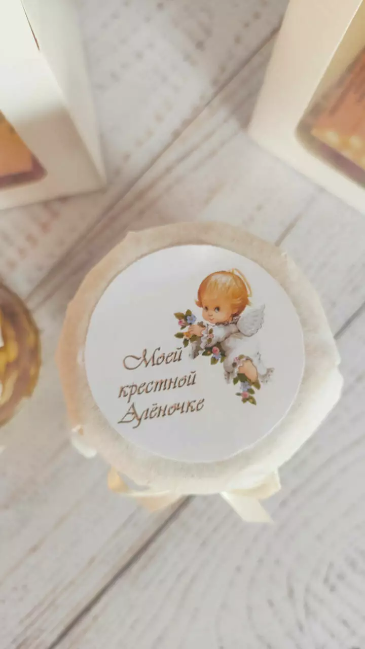 Солодкий подарунок для хрещених на згадку про радісну подію хрещення. За наповненням може бути ніжний крем мед (з полуницею, смородиною, цитрусом, какао з фундуком, солоний горішок) або мед з цільними горішками (мигдаль, фундук, арахіс, грецький, кешью з вишнею).