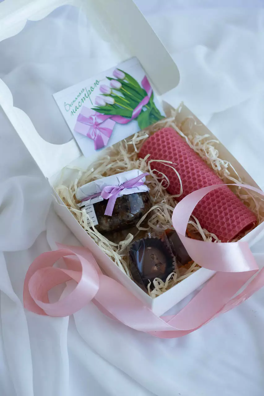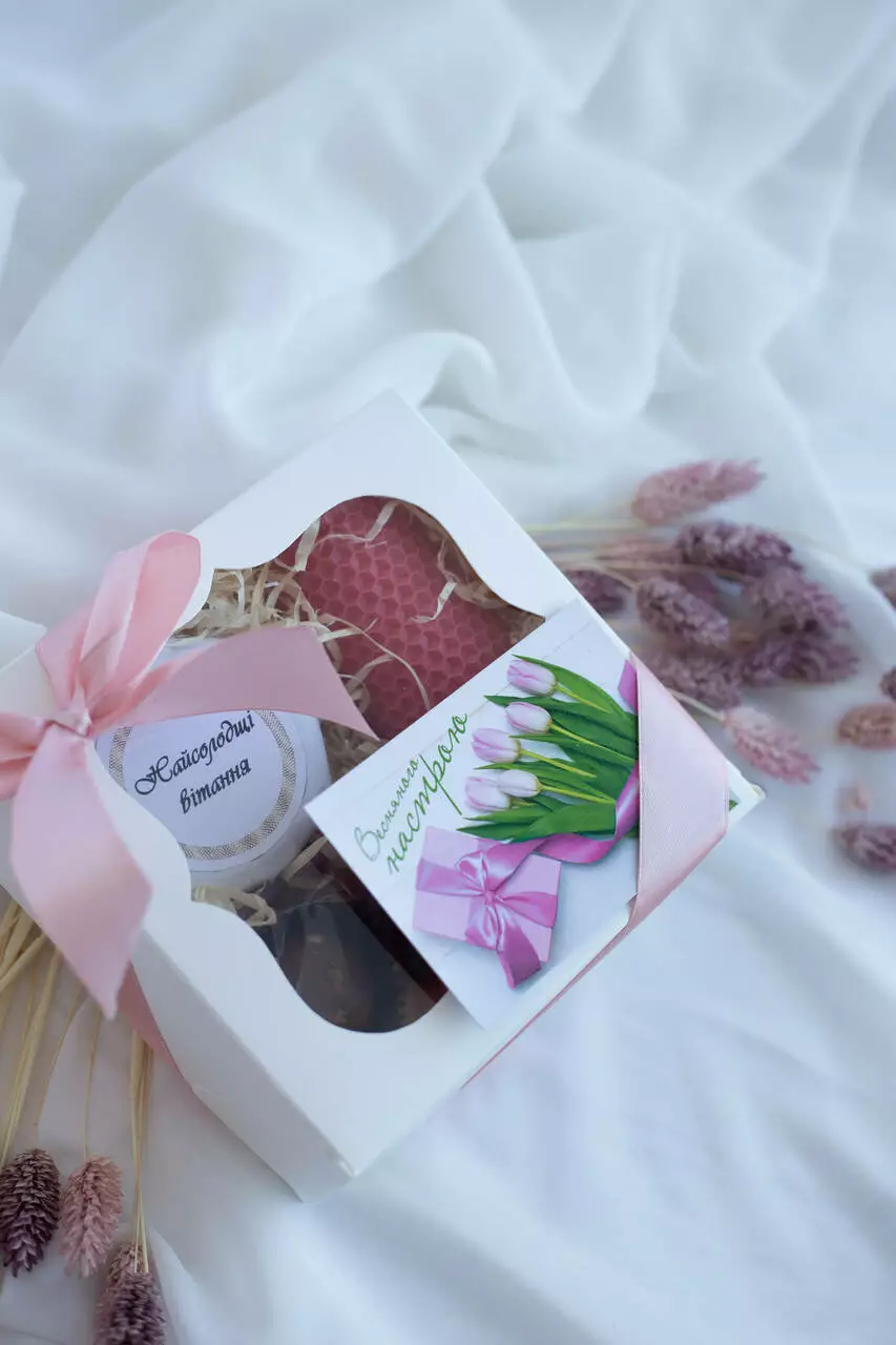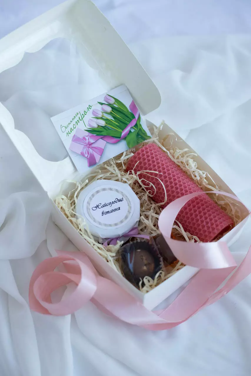 Зробіть свято 8 Березня ще приємнішим із цим вишуканим подарунковим набором! Ідеальне поєднання натурального меду, бельгійського шоколаду та аромату бджолиного воску створює атмосферу тепла, ніжності та турботи.