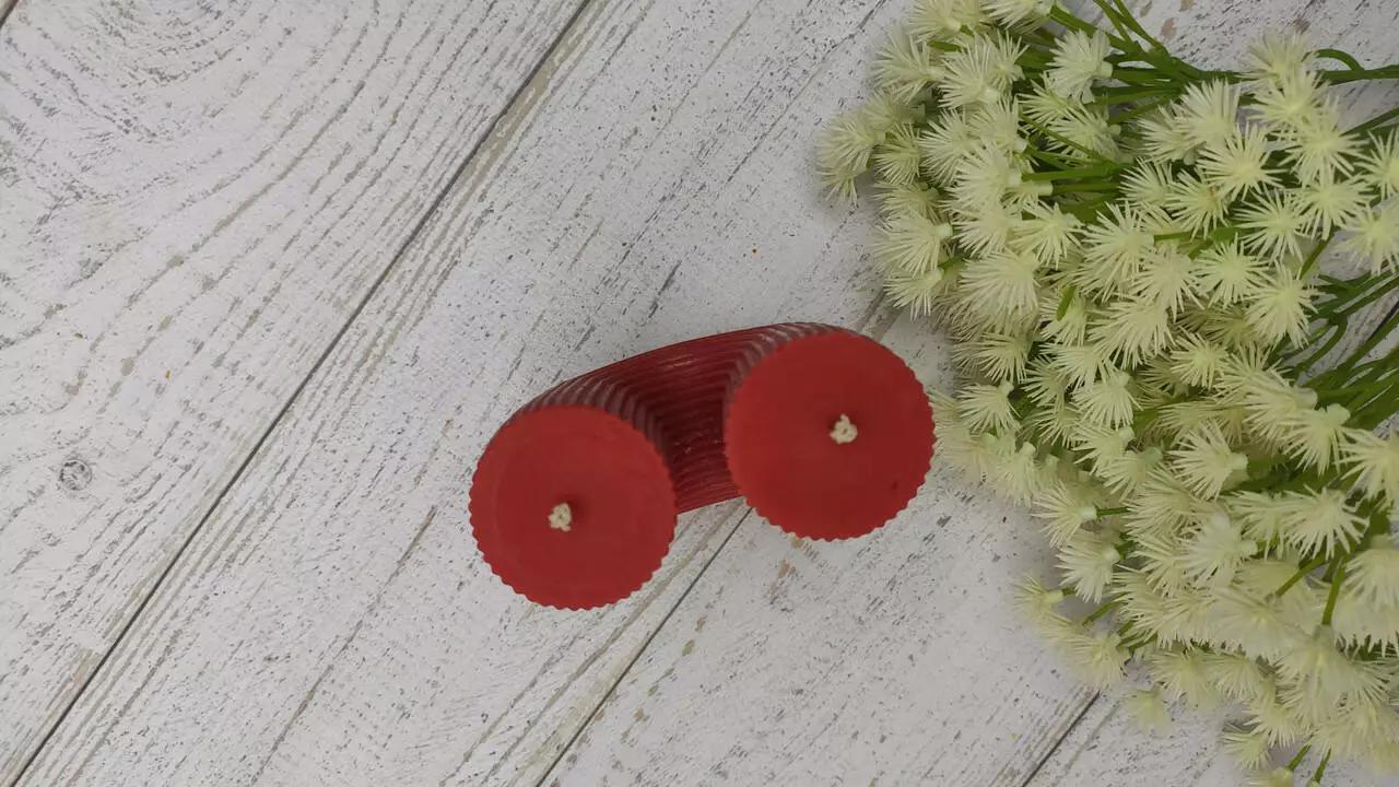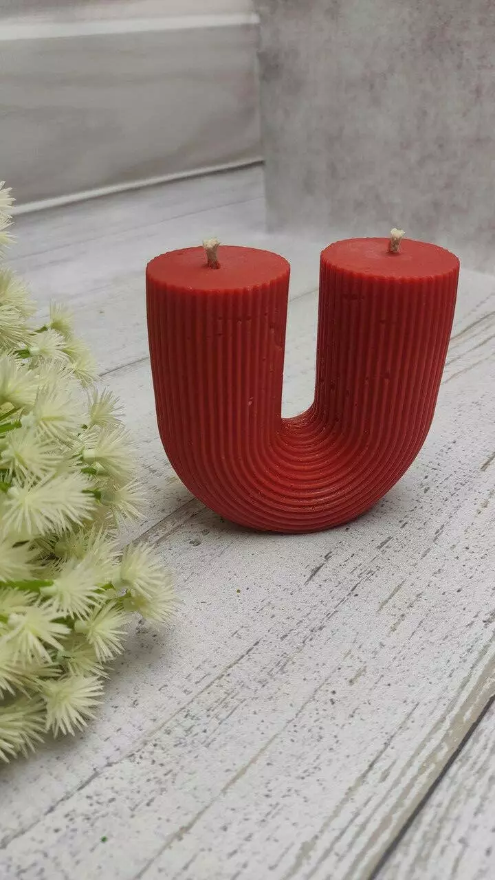 Стильна свічка і дуже оригінальна завдяки подвійному розташуванню ґноту. Гарно виглядає в інтер'єрі. Виготовлена з натурального бджолиного воску. Для фарбування воску використовується тільки спеціалізований свічковий барвник, який не має стороннього запаху і не виділяє шкідливих речовин при горінні.