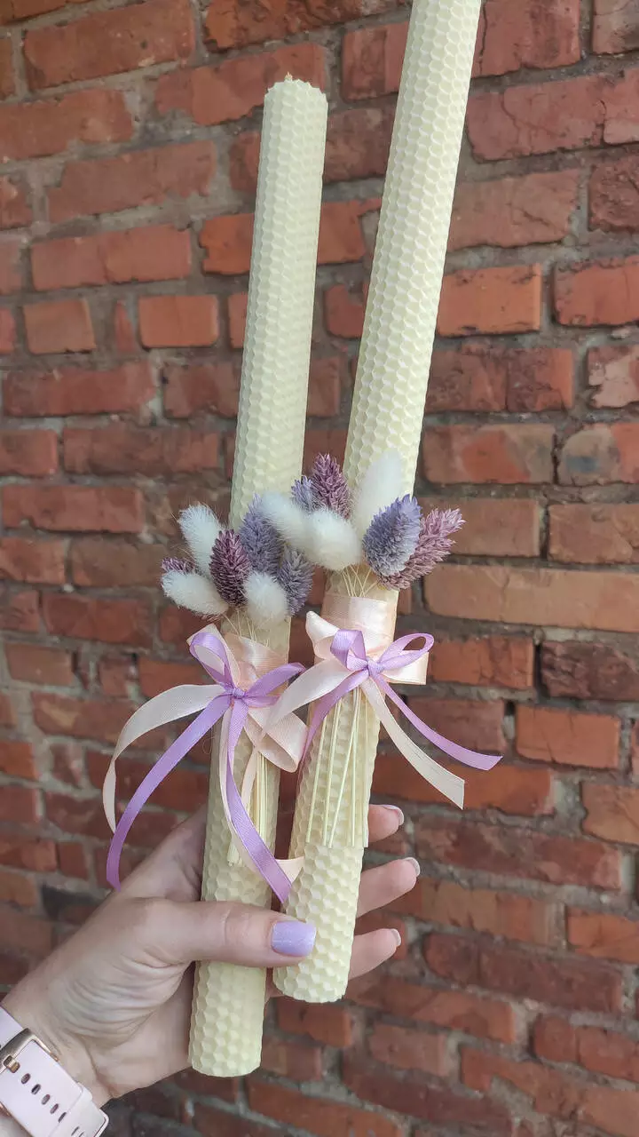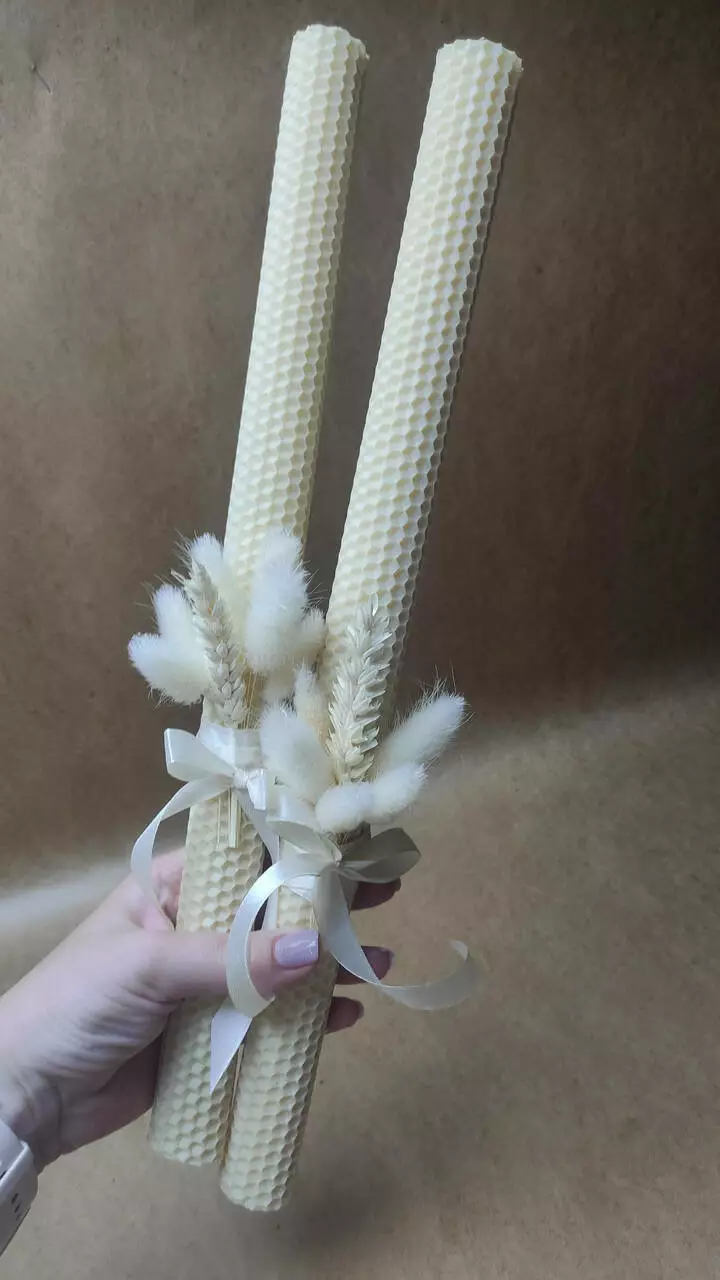 Вінчальні свічки з сухоцвітами ніжного молочного кольору, виготовлені з бджолиного воску ручної роботи. Ці свічки привертають увагу своєю неповторною красою та вишуканим декором з атласної стрічки та сухоцвітів.