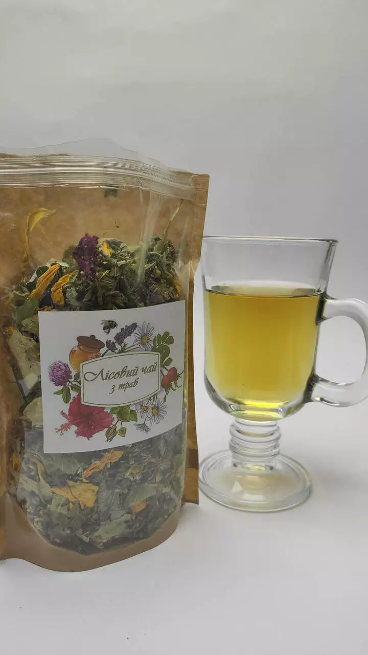 У складі: листя суниці, листя вишні, цвіт акації, жасмін, листя малини, ромашка, шавлія, чайна троянда, зверобій, чебрець, липа, м'ята, буркун, деревій, соняшник.
