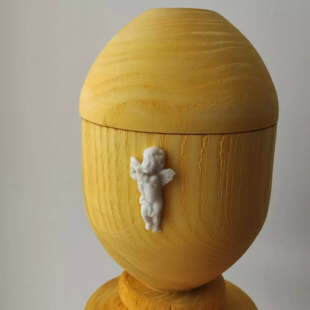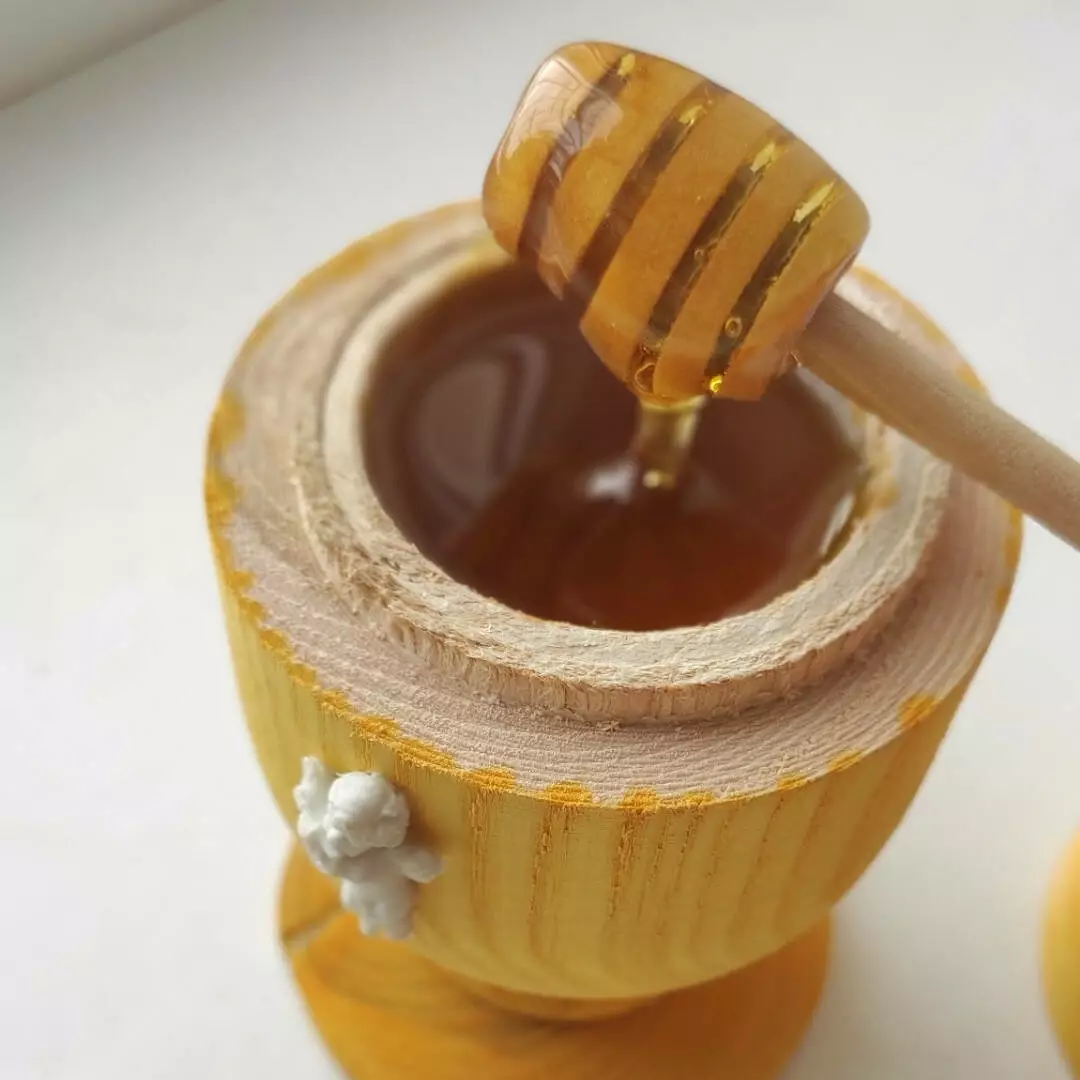Пасхальне яйце зроблене з цільного дерева, всередині покрита тонким шаром бджолиного воску і наповнений смачним і запашним медом з власної пасіки. Яйце декороване янголятком.