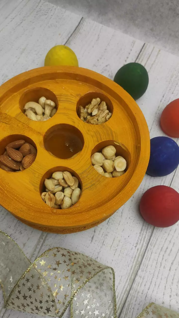 Усередині покритий тонким шаром бджолиного воску і наповнений смачним і ароматним медом із власної пасіки, а також горіховим асорті (волоський, арахіс, мигдаль, фундук, кешью).
