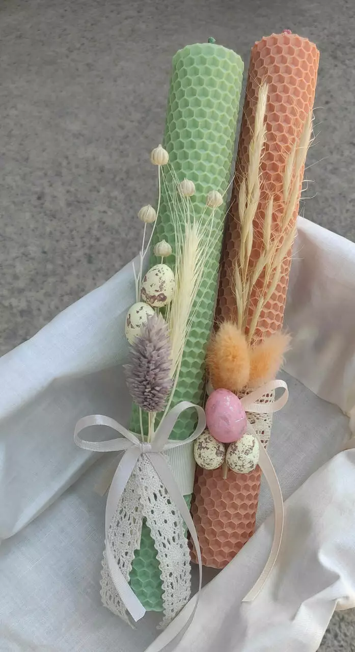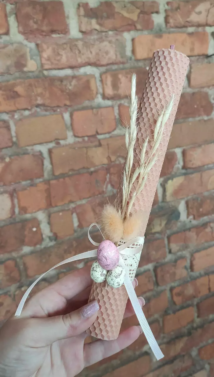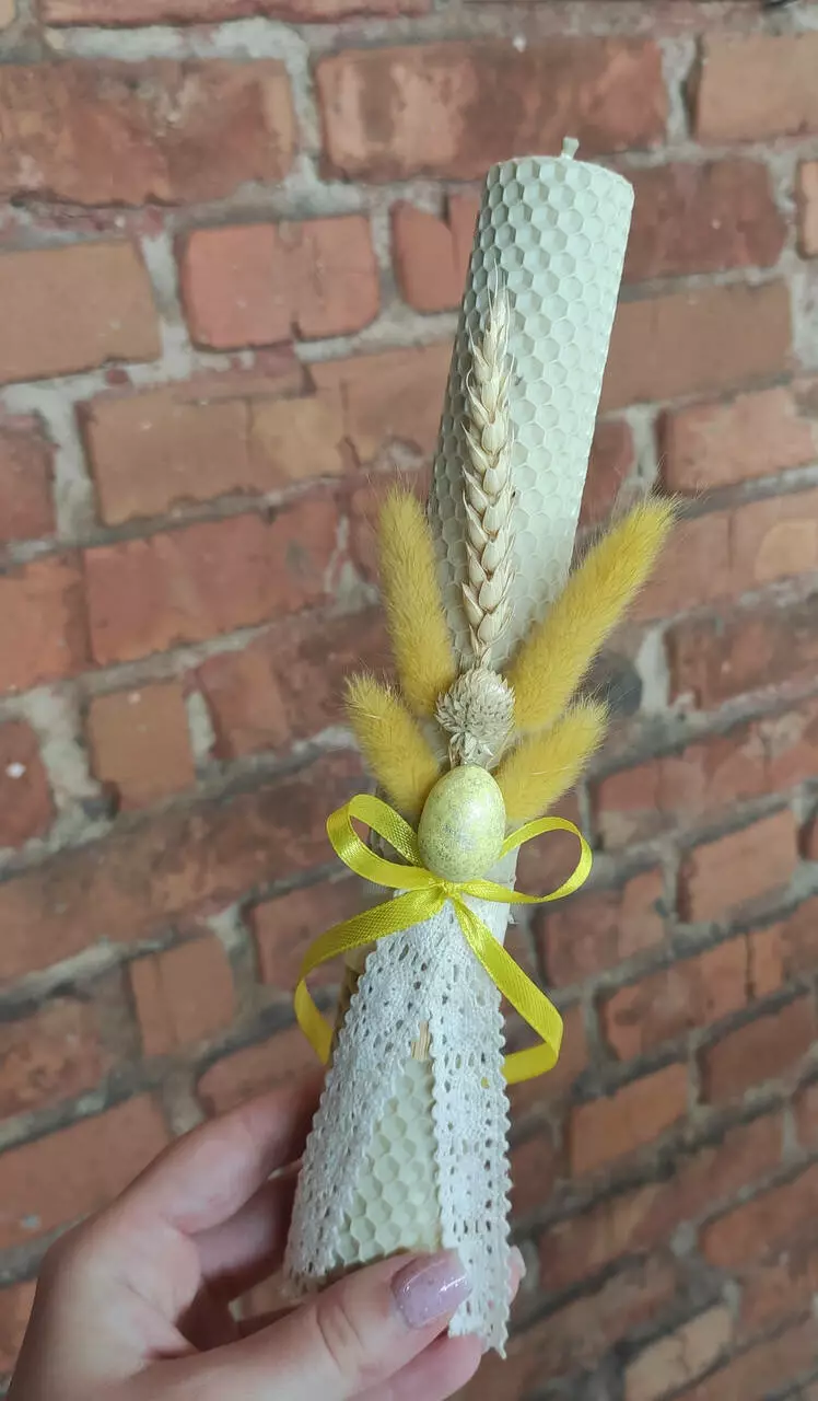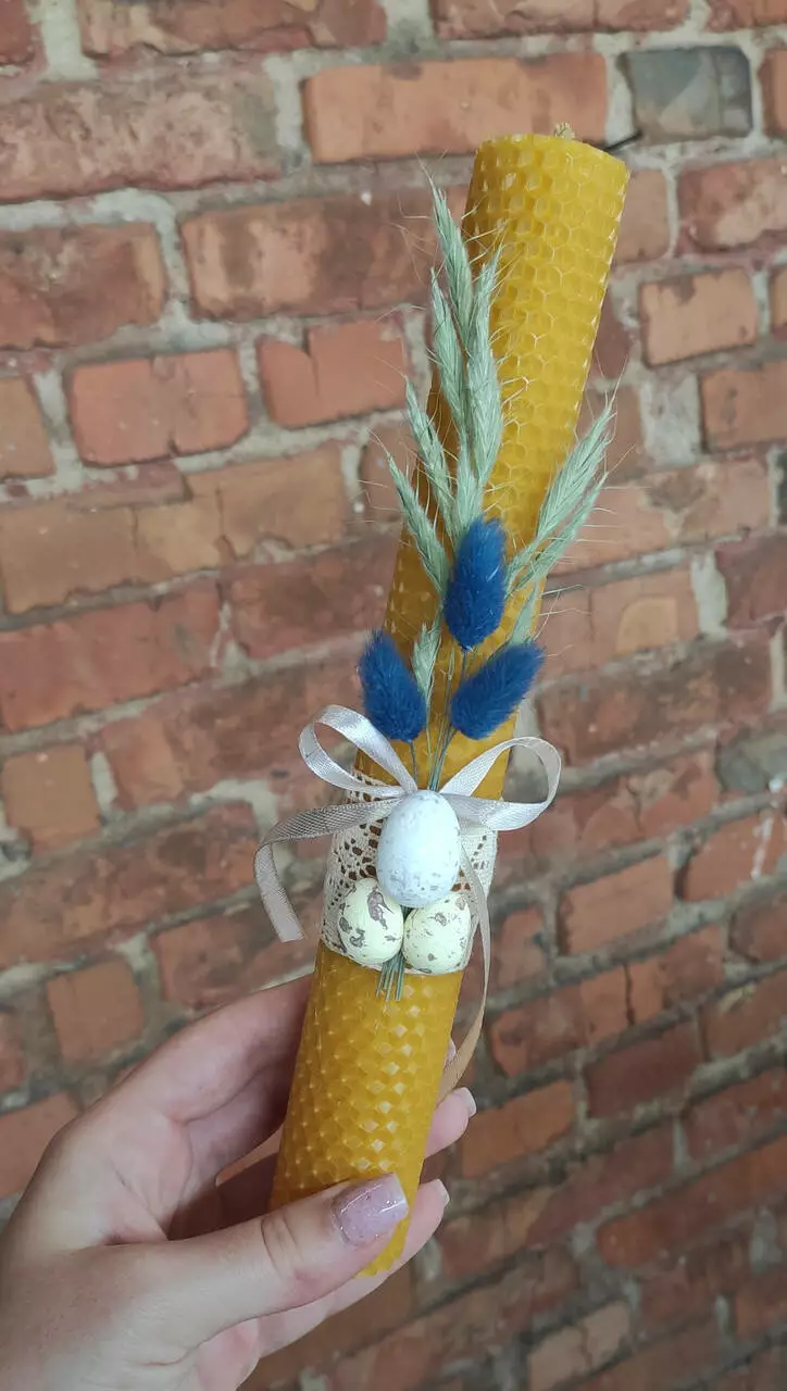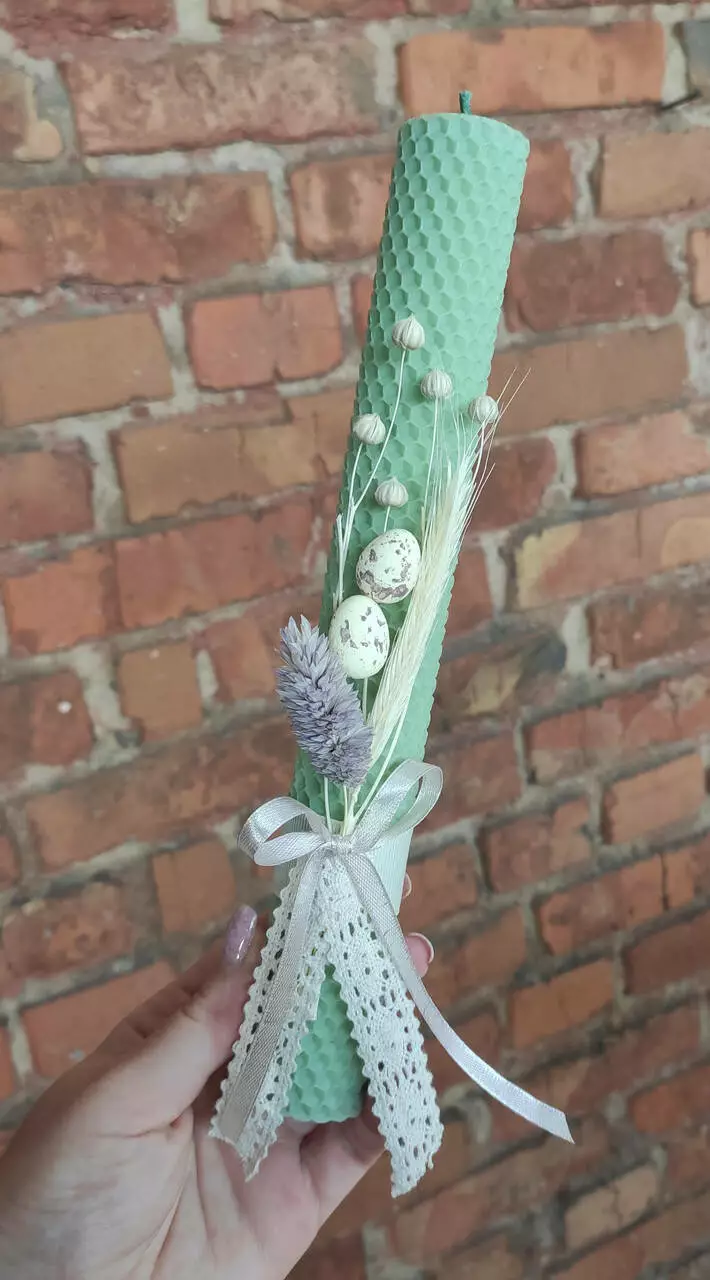 Воскова свічка великодня з декором - це унікальний ручний виріб, який додасть особливу атмосферу і красу вашому святковому столу. Свічка виготовлена з натурального бджолиного воску та має висоту 25 см, що гарантує її тривале горіння.